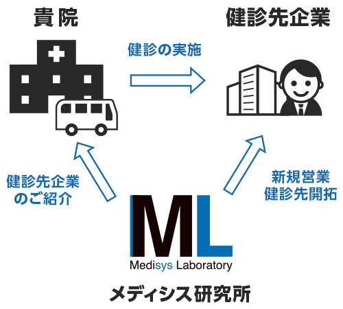 事前に貴院から対応可能な健康保険組合、検査項目、地域、受診者数などを伺い、 ニーズに最適な事業所をご紹介させていただくサービスです。